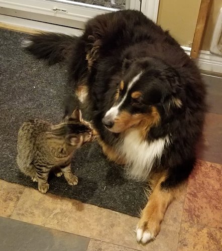 Bandit was born in a home with a Great Dane, who was so kind and gentle. Charlie thought the kittens were his responsibility. So Bandit was happy to find another big dog to snuggle with. |
