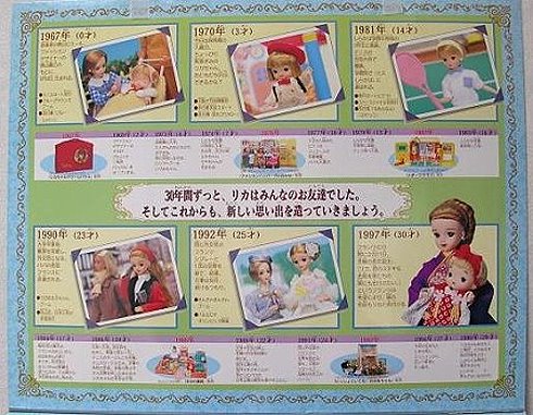 In 1997, Licca celebrated her 30th Anniversary with three Gift Sets depicting different stages in Licca's life. The Stages were 1967, Birth; 1970 Kindergarten; 1981 High School; 1988 College; 1992 Marriage; 1997 Motherhood. The Sets came in three versions, Blue, Pink and Yellow(yellow was the hardest to find).