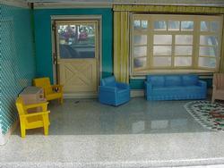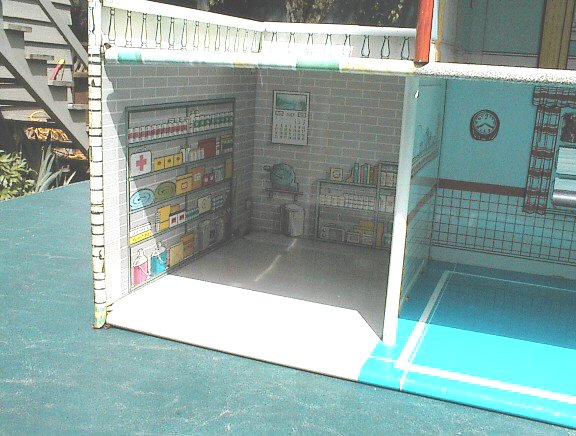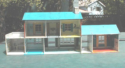 It took three years to track down this house. Here is the ultimate in tin litho dollhouses--The Bomb Shelter House. Without a doubt the rarest of all Marx houses, this house was produced in 1962 only. It was inspired by President John F. Kennedy's appeal to the citizens of the U.S. to be ready for nuclear war if the Cold War with Russia should take a turn for the worst. The house however was not a big seller, and thusly it is very difficult to find. The house came with the rare Dutch door. This rare house was featured in the 1962 Sears Christmas Book.