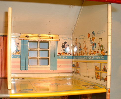 The interior of the house is so fifties. It includes five rooms: living room/dining room, kitchen on the first floor and nursery, bathroom and master bedroom on the second floor. The nursery on the upper right has the Disney motif and was marked Disney. |