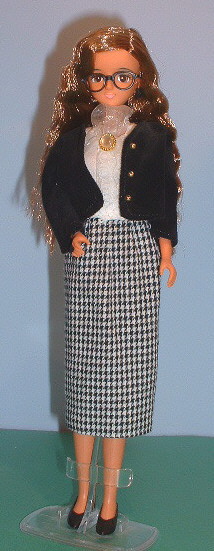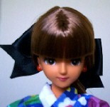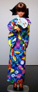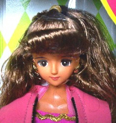 Ellie first appeared in 1984 when Jenny was still called "Barbie". In 1986 she was released as a different character in the 1st generation "Jenny's club". The "new Ellie" put on the market in 1992 was a little taller and one year older. At the same time a light-skinned version with blond hair was also released. Also in 1992 another version appeared called "stylish doll Ellie" with improved proportions. Actually, it seems that Ellie very nearly escaped not ever coming into the world at all! Lots of prototypes are made of Jenny friend dolls, and whether or not they are actually produced is decided by their main target : Japanese children. Ellie, with her "grown-up" look unlike any of the previous dolls, was very popular among Takara employees; but tests with children always had negative results. Ellie was not popular at all with them. Of course, in the business world products that don't test well aren't produced...but the staff at Takara loved her and really wanted to have a go. One of the big themes that year was called "Life-style Coordinate", and in particular there was at Takara a plan to release 6 dolls, with the concept that you chose dolls as you choose clothes to fit your style or mood. Those six dolls were the six models of "Jenny's Club", and Ellie was released as one of them. The staff at Takara were in a cold sweat, but it turned out that Ellie sold amazingly well. However, when they sorted out the replies to the questionnaire included with each doll, they found that the average buyer was a 27-year-old female! It seems that, thanks to Ellie, lots of grown-ups joined the ranks of Jenny & Co. fans at that time. (From MFDB #6) Ellie is from New York and is 18 years old (sign of the Zodiac : Capricorn, blood type : B). She's very open and outgoing and makes friends easily. Here she is sporting "geta" (wooden sandals worn without socks - here in plastic of course) and a cotton kimono (yukata), often worn by girls and young women for summer firework festivals in Japan.