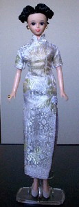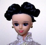 Lina appeared in 1992 as a member of "Ellie's club". This version is a Totoco original. She's from Vienna and is 20 years old Her height is 29 cm (2 cm higher than Jenny and most of her girlfriends). Her body has more detailed sculpting (ankles, collar bone, spine ; this is the "Eighteen Jenny" body supposed to represent Jenny one year later) than most of the other dolls. She's wearing a ravishing Chinese-style dress and her hairstyle is exquisite too. | |||||||||||