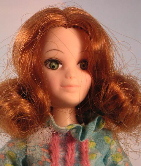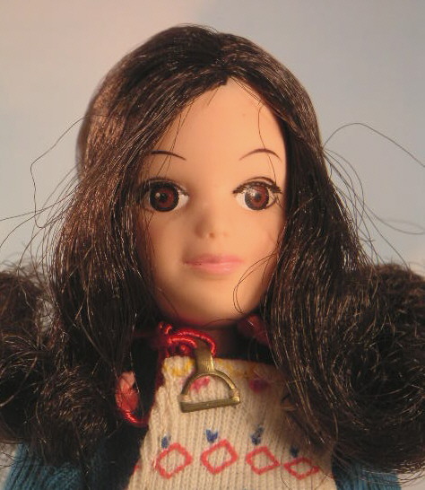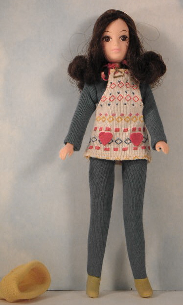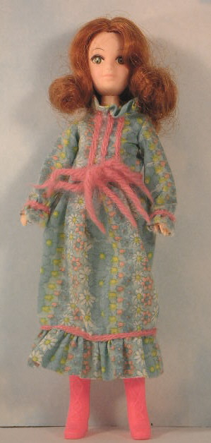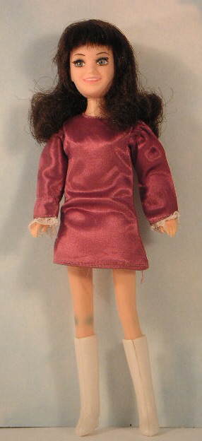 MusicMusic is not wearing her original outfit, but she is wearing a World of Love tagged outfit, which is shown in the 1973 World of Love Catalogue. She is wearing the dress only to her #4422 Deluxe Music. Unfortunately Music is suffering from a common problem with these dolls. Her knee joint is showing some blue stains.