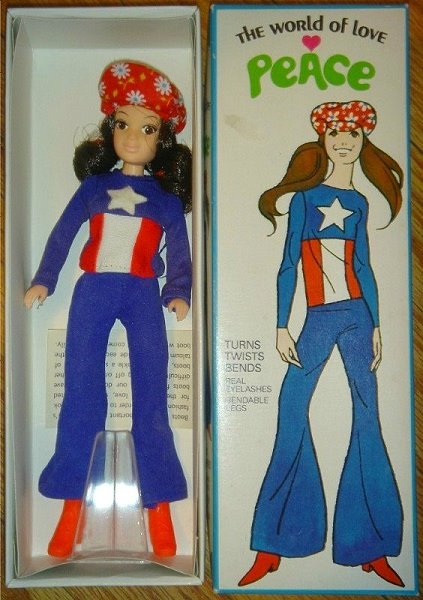 PeacePeace is not wearing her original outfit, but she is wearing a World of Love tagged outfit. The outfit is Love Jumper, which also appeared in Europe for the British version of the World of Love dolls called Miss Matchbox Disco Girls. The outfit is called Pop Pinny in Europe. To see her with the hat on, check the pictures of the group at the top and bottom of this page.