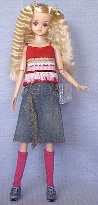 This doll was available for order at Takara-bako (Takara's online shop) in late 1999. It was possible to choose the color of her eyes, her hairstyle, her hair color and her skin tone (3 choices in each category). In the following page you can see another Marine with the same hairstyle as this one but slightly darker hair, and one with a different hairstyle. This Marine was announced as the 1st in the "Proud of my girl" series, the 2nd and 3rd dolls in the series are Ellie and Kisara. This doll's body was replaced with a fair-skinned SA body and she is wearing an outfit by Daisy-D.