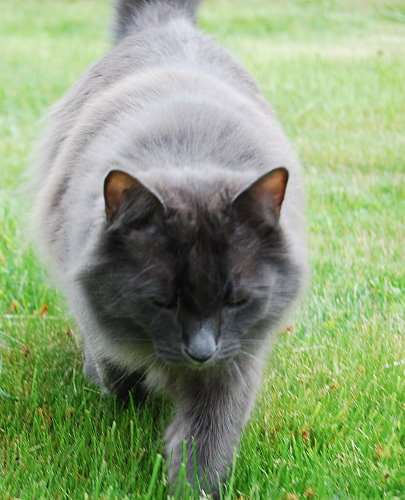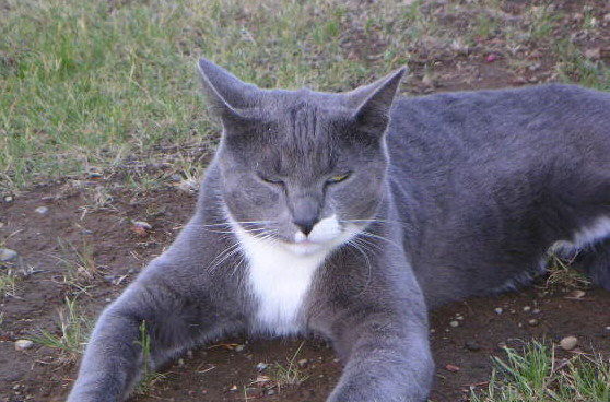 BP (BushPuss) - Beepers, was found with her sister Bikini(a sleek shorthaired black) at the barn where we boarded our horses in Tsawwassen. In November of 2000 when the girls were 7 years old, we moved to Langley to a farm of our own. Bikini however would not come with us and remained with our good neighbours Barb, Jim and Amanda. When we visited her, she still knew us and would cuddle up. Bikini(whom Barb had renamed Tina) passed away in 2012. Beepers, was a beautiful Russian Blue mix. She moved with us to the farm and loved hunting mice in the field behind the house. The summer of 2001, she went missing and we suspect the coyotes found her. We still hope that she just wandered to the other side of the field and got lost and found a new home over there.