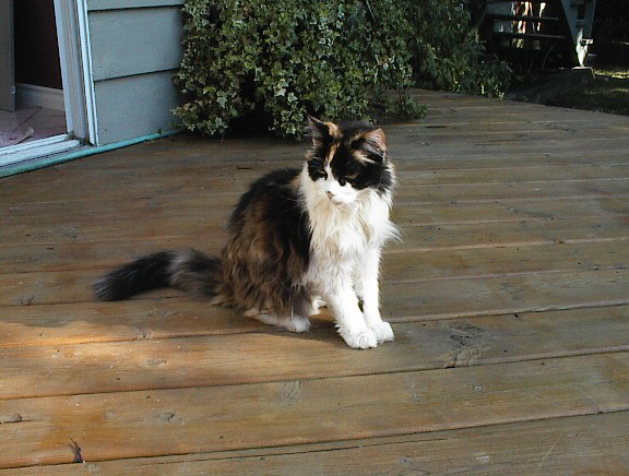 Taffy - We got Taffy from our neighbours, when their cat Tiffy had kittens. Taffy was a beautiful calico cat. She had long luxurious hair and was quite the princess. Taffy lived many years with us in Tsawwassen. In her later years she became quite frail and wouldn't come upstairs to sleep in the bedroom anymore. One morning I was on my way to school(I'm a teacher) and she was sitting at the top of the stairs. I petted her and said Good Morning Old Gal, unusual to see you up here. I went off to school, which was only a 10 minute drive. When I got there, there was a message to call home. My daughter was distraught, something was the matter with Taffy. I raced back home to find Taffy sleeping with her head on the doorstep, when I patted her, I knew we had lost her. We buried Taffy in the side yard of the house, the only place she had ever lived.