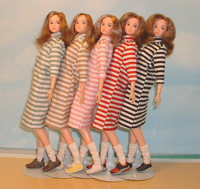 May/June 2002 brought five new Momokos. They were: -- ver.02SPpk border print: pink/white shoes: red wallaby shoes *Sold exclusively at Hara Museum -- ver.02SPgr border print: green/white shoes: brown sneakers -- ver.02SPbk border print: black/white shoes: black wallaby shoes -- ver.02SPbr border print: brown/white shoes: brown wallaby shoes -- ver.02SPrd border print: red/white shoes: red sneakers. As the dolls were all the same save for the dress, I only purchased one. Here she is with here friend Keiko(on left):. Each doll is limited to 190 pieces. Then I began to notice how the hair was different on each doll and then I decided that I should probably get them all!!! So...............and then there were five! I have been told that the girls in the brown and pink outfits are wearing the incorrect shoes.