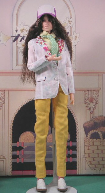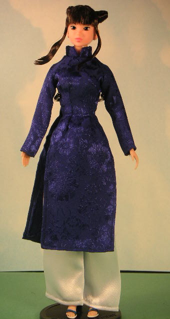 | Clothing | Dark blue tunic, white pants in the Ao Dai style of Viet Nam/second outfit brown tank top with brown net overlay, brown pleated mini skirt with belt, silver heart on chain |