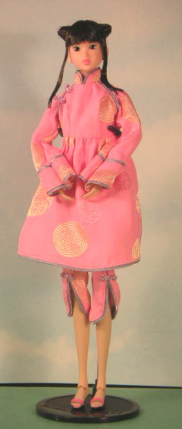 | Clothing | Pink Chinese style dress and matching knee length pants/second outfit is black/pink pinkish heart T-shirt, black pleated mini skirt, knee length black socks with heart motif |