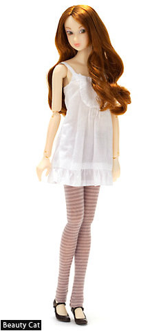 | Clothing | Doll is available in three different old stock outfits. 1. Black knit baby doll, trousers and ballet shoes. 2. White knit baby doll and Shangtung silk half pants (beige or ivory), wedge sole pumps. 3. Orange knit top and knit bloomer. |