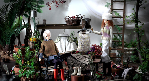 | Clothing | Floral cami all-in-one, high-necked knit cut, melange knit vest, organic cotton gauze pants, piping switching skirt, fur Russian hat, melange high socks |