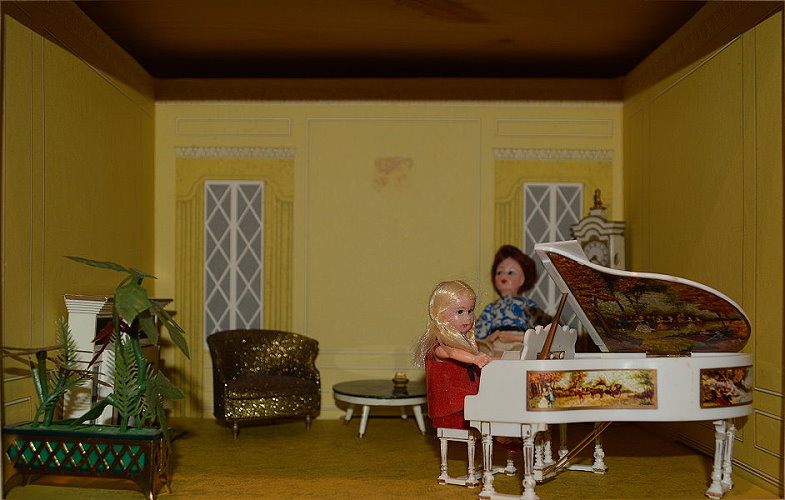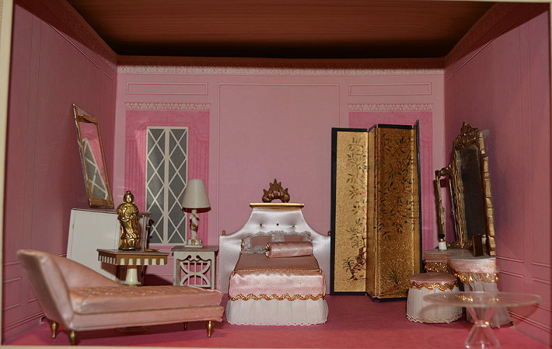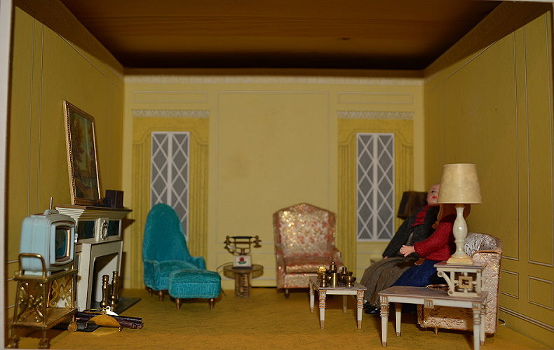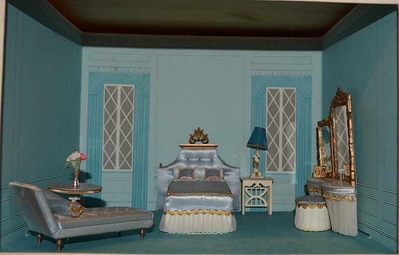In 1964, the Ideal toy company brought out a line of dollhouse furniture termed, "Fantasy Furniture". It truly was a fantasy, fit for a princess. I have never been able to secure the house for this furniture, and the vinyl house doesn't appear to me to be big enough to display all the furniture. At first I placed the furniture in a Marxie Mansion and it looked quite good. I have now managed to buy enough of the individual Petite Princess rooms for each set of furniture. Each cardboard room is meant to house one roomful of furniture. The rooms are identical in litho, but are coloured blue, pink, or yellow. The rooms are housed in an Ikea Ivar shelf unit. It is a good solution for housing the large rooms as they fit perfecly onto the smaller shelves.