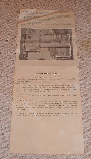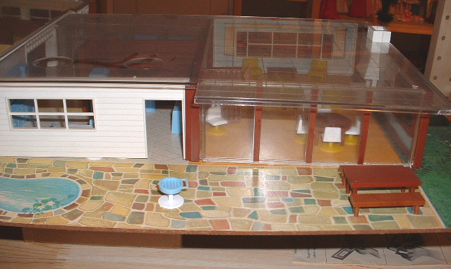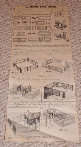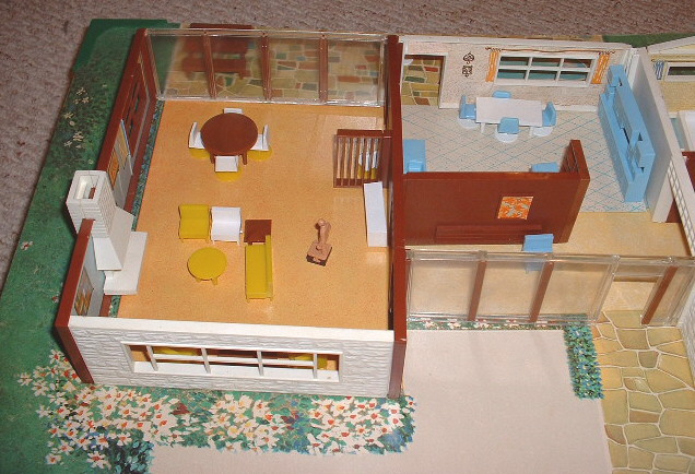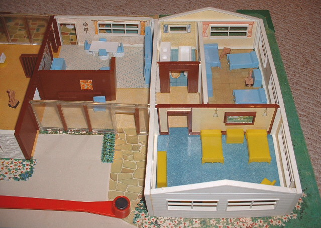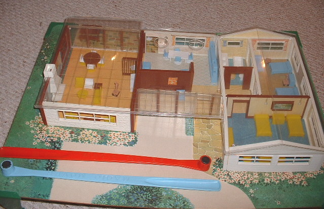 This great house was produced by Remco Industries in 1963-65. This house must have been produced later as the earlier houses had solid rooves. The roof lifts off for easy placement of the many pieces of furniture. The whole house sits on the base, which is made from pressed wood. The four plastic legs elevate the house so that the user can place the magnetic wands under the house and move the people, animals and the car all around. Sadly my house is missing the animals and the car.