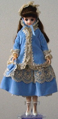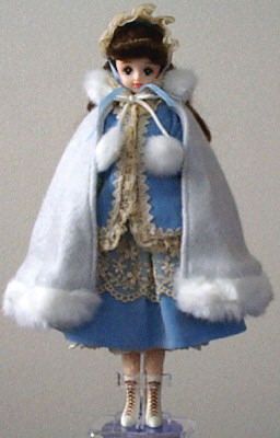 She's wearing a woolen cape trimmed with fur, and a velvet