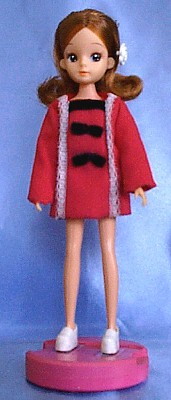 The dress she is wearing is actually a 1st generation outfit and is called "Port Wine". She's standing on a real magnetic stand from the "New Licca" period (but actually meant for her mother), when you push the stand it looks like she's actually walking. This is a late period 2nd generation Licca, #6 from 1979. She has a slightly smaller, rounder face than the doll below.