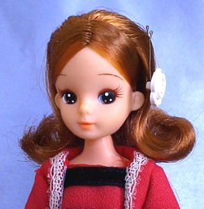 This is a second generation Licca, a #4 (around 1975) according to Ms. Nakamura Futaba's classification ("Licca and Japanese Fashion Dolls"). She's in absolutely mint condition and looks fabulous, the only thing missing is the white rose in her hair. She's half an inch smaller than the current version of Licca, and she has a big head and a small body, so recent clothes don't fit her well.