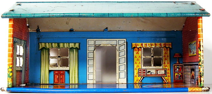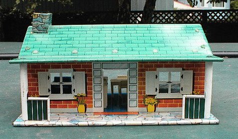 This house was very much like the Happi-Time Cottage, but it was manufactured in England by Marx UK in 1952, and was not sold as a farm cottage. It has been called the Swansea cottage by collectors. Marx seldom offered their tin litho houses outside of the US, so this is a rare exception. A visitor to the site from Wales has shed some light on why collectors might have called this the Swansea Cottage. Louis Marx started production in the UK in 1931 during WW2 the government took over his factory for vital war production and the Marx factory was moved to Swansea Industrial Estate in South Wales as a part of the Government attempt to re vitalize the area. This house was produced in the UK around the time of the move to the new factory and it seems likely that this is how the house was named. For the full text visit: http://www.knightsandvikings.co.uk/factory.htm
