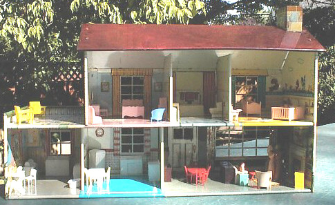 Inside the house has exactly the same configuration as the Disney or Colonial with a garage, except of course that it has a utility room in place of the garage. Mom and Dad seem to like the house, they're dancin' the night away in the livingroom. This house was featured in the 1957 Simpson-Sears Canada Christmas Catalogue. It was my original one and only dollhouse. Now I know where Mom got it!!!